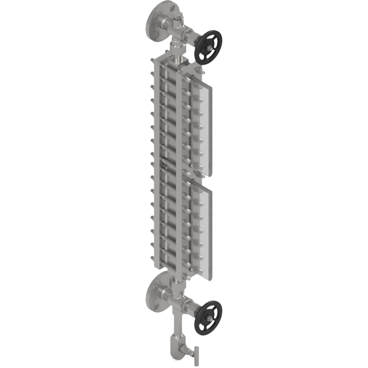 suitable for observation of the level of corrosive and colored liquids. The type is preferably used for reservoir tanks that require a comparatively long visible length. This type of level gauge utilizes two pieces of tempered flat gauge glasses, each of which is placed in front and rear of gauge body and is sandwiches by gauge covers and tightened by bolts from both sides of the gauge.